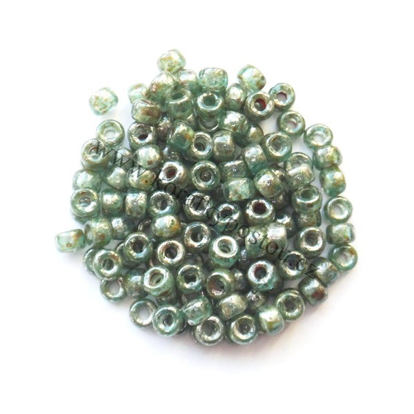 Mačkané rokajlové korálky MATUBO™ 6/0 , rozměr 4,1 x 2,9 mm (po délce průvleku), provedení Opaque Aquamarine - Silver Picasso. Balení 10 g.