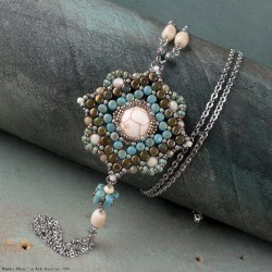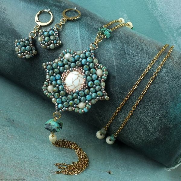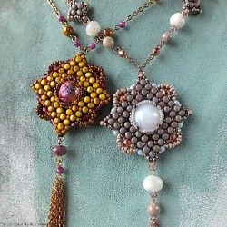 Na tomto kurzu si vytvoříme půvabnou sadu výrazného přívěsku/náhrdelníku a minimalistických, ale neméně půvabných náušnic ve stylu inspirovaným orientálními paláci, mozaikami a architektonickými prvky. Ukážeme si, jak využít oblíbené korálky Matubo Rulla v pravoúhlém stehu a vytvoříme tak základ přívěsku, do jehož středu všijeme drobný bižuterní kámen a jehož okraje následně dozdobíme jemnými, ale nepřehlédnutelnými detaily z českých broušených skleněných korálků - a jako bonus si vytvoříme drobné šité komponenty, které můžete použít jako náušnice ladíci s přívěskem a nebo jako doplňkové ozdobné komponenty ke kompletaci přívěsku - to už je jen a pouze na vás.